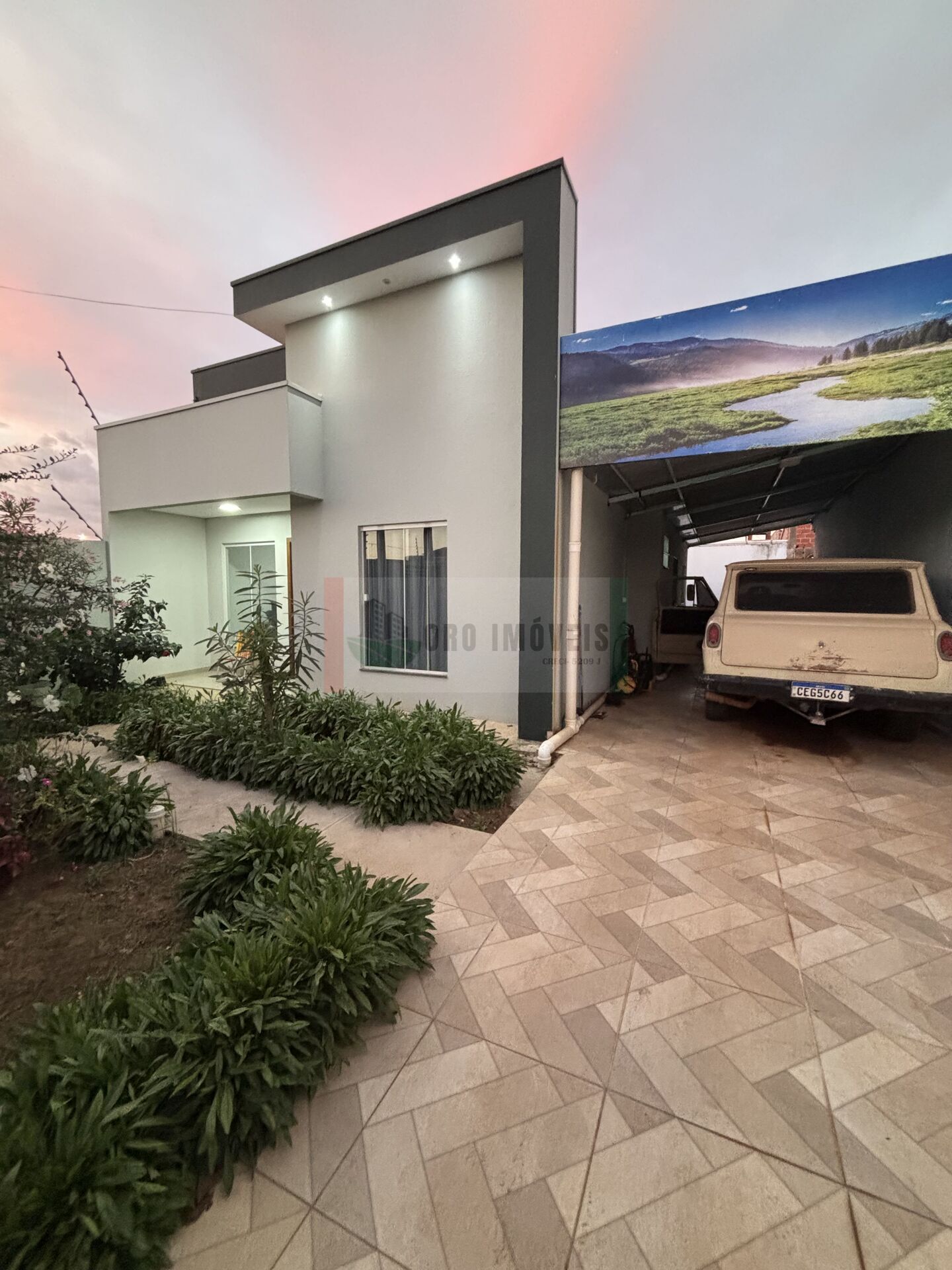 3 quartos, 1 banheiro, sala, cozinha, garagem coberta para 2 carros.